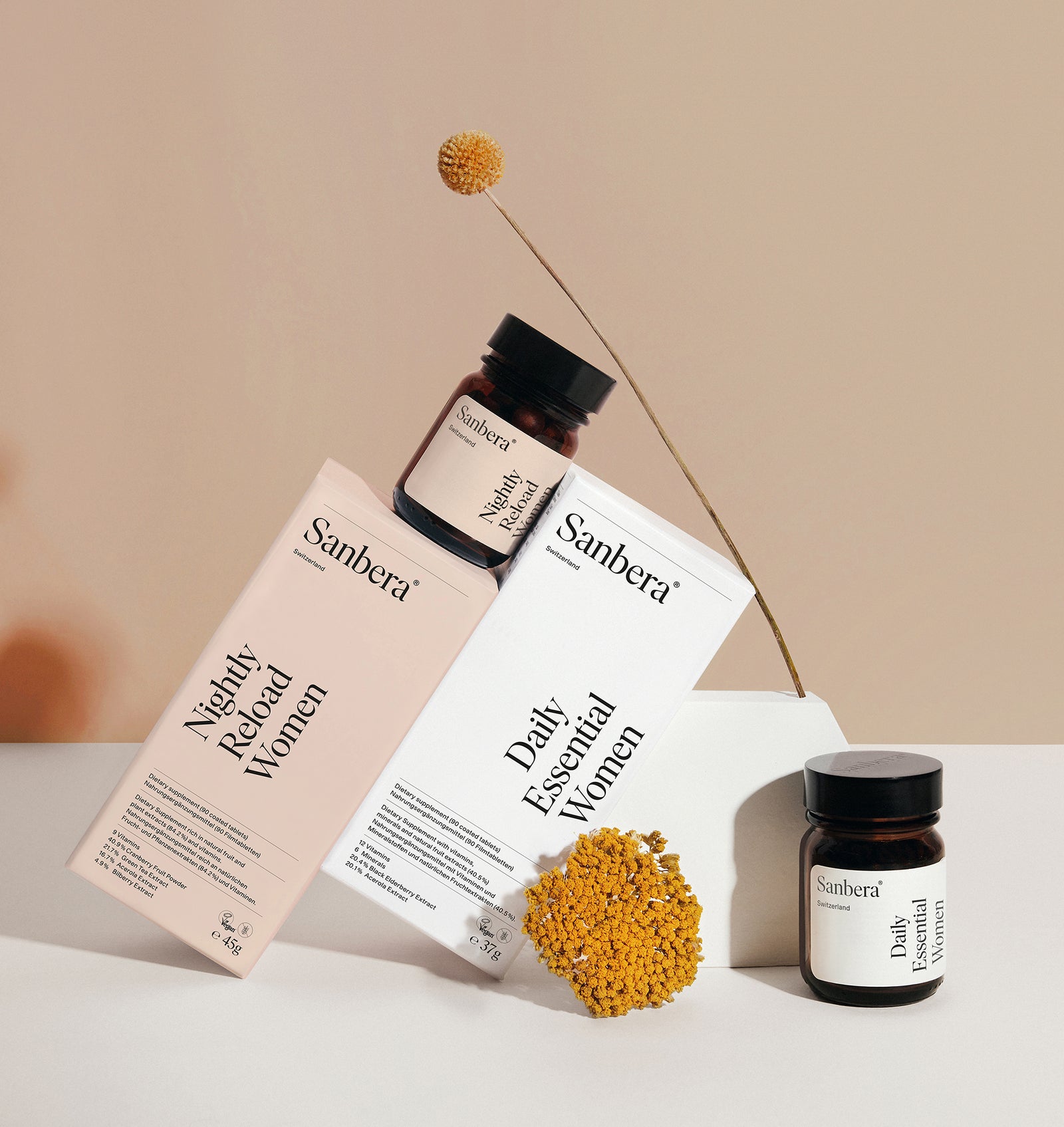 As a Swiss brand, we understand the power of fresh air, good nutrition, outdoor exercise, and a balanced lifestyle. However, our nationality also makes us realists - we know that modern life and our responsibilities can be our biggest distraction from self-care. Wellness rituals can take time, so to be a truly sustainable practice we wanted to create a product that would fit seamlessly into our busy lives: The solution to the challenges of modern living, inspired by our nation’s love for nature. A grand ambition? We know. So, we designed Sanbera: Swiss-made, plant-based, daily supplements, custom-designed for her and him.